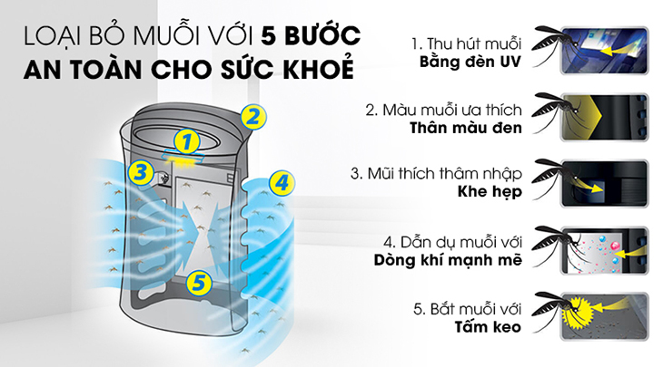 Bằng biện pháp ánh sáng UV, cửa tối dẫn muỗi, luồng khí hút và miếng dán muỗi đặt bên trong chiếc máy lọc không khí, lượng lớn muỗi và côn trùng nhỏ sẽ bị bắt lại bên trong thân máy.