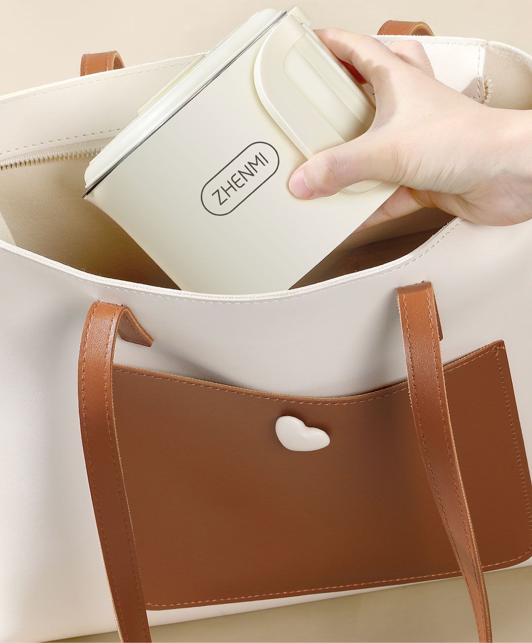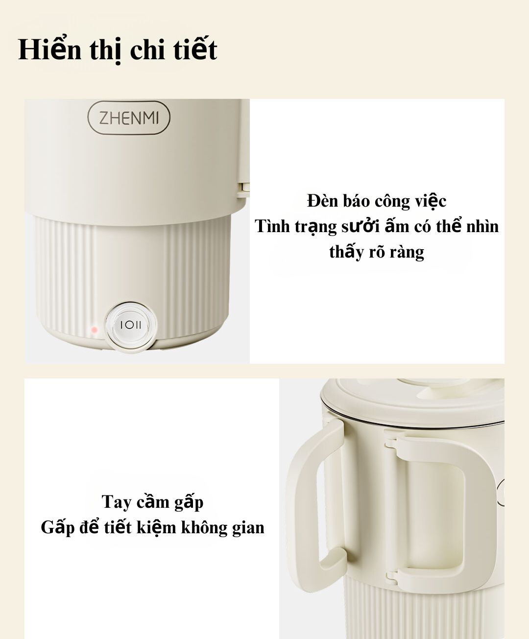 Thân ấm: Thiết kế thân ấm màu trắng ngà với logo thương hiệu Zhenmi được in rõ ràng. Thân ấm được thiết kế chắc chắn, gọn gàng, phù hợp với không gian bếp hiện đại.