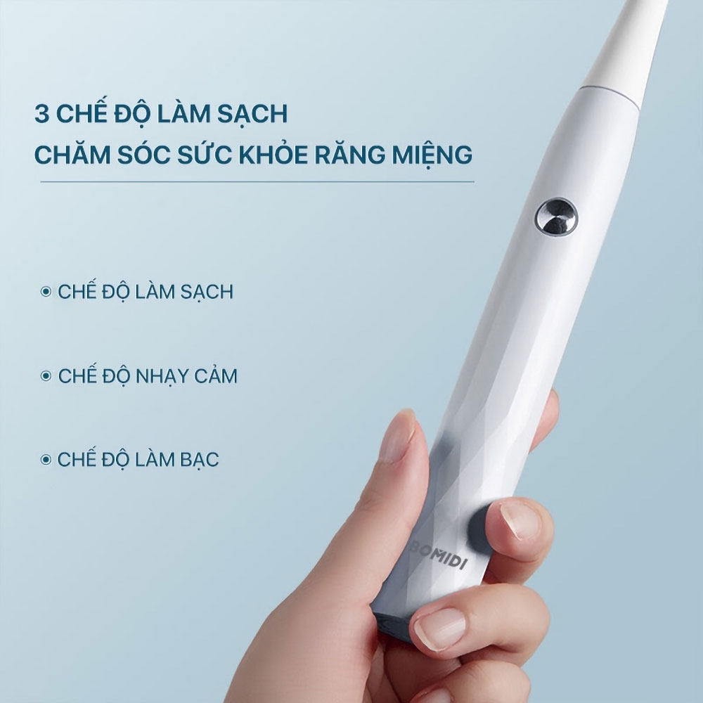 3 chế độ hoạt động được trang bị là chế độ nhẹ, chế độ tiêu chuẩn và chế độ làm sạch sâu giúp đáp ứng đầy đủ cho mọi nhu cầu làm sạch cho từng cá nhân người dùng khác nhau. Ngoài ra, bàn chải điện giá rẻ Bomidi cũng được tích hợp chức năng rung để nhắc nhở người dùng thay đổi vùng làm sạch, tránh chải một chỗ quá lâu để toàn bộ khoang miệng đều được làm sạch đều và hiệu quả hơn.