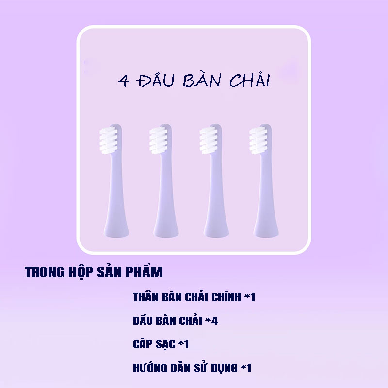 Hộp sản phẩm bao gồm *1 thân máy - * 4 đàu bàn chải - * 1 dây sạc - * 1 sách hướng dẫn