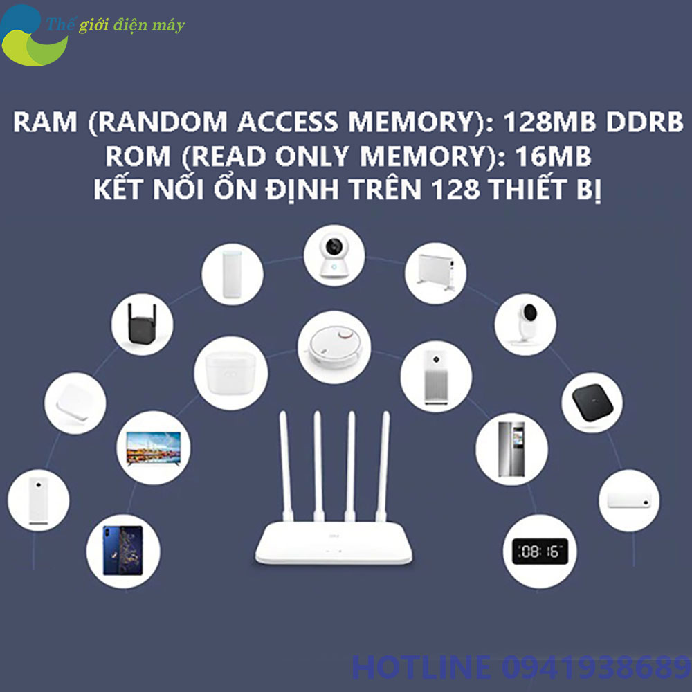 Bộ Phát Sóng Wifi Xiaomi Mi Router 4A Gigabit được thiết kế Bộ nhớ truy xuất ngẫu nhiên RAM (Random Access Memory) lên đến 128MB DDRB kết hợp với Bộ nhớ chỉ đọc ROM (Read Only Memory) 16MB cho phép gia tăng kết nối ổn định trên 128 thiết bị. Hoàn toàn bạn có thể kết nối ổn định tất cả các thiết bị như điện thoại, laptop, tivi, camera, robot hút bụi… trong gia đình, quán cà phê, nhà hàng, công ty.