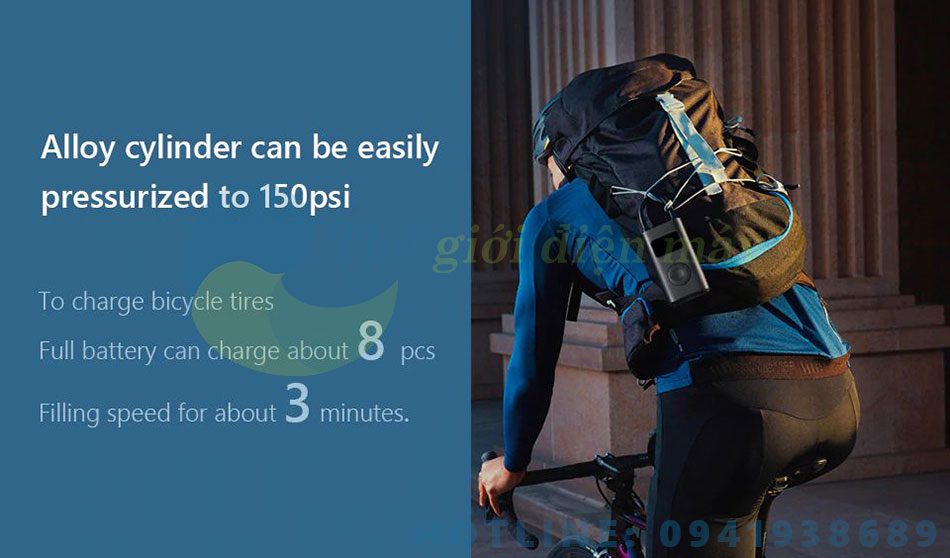 Bơm được tích hợp pin lithium 2000mAh và được sạc đầy qua cổng micro USB tiện dụng với thời gian sạc đầy chưa tới 3 giờ. Trong khi đó mỗi lần sạc đầy bơm có thể cho khả năng bơm 8 lốp xe đạp, 6 lần cho lốp xe máy, bơm bóng đá trong 1 phút, lốp xe hơi được bơm đầy trong khoảng 3 phút,… vô cùng nhanh chóng và tiện lợi.