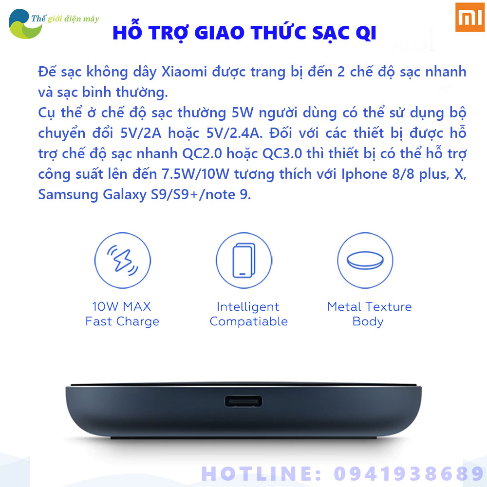 Đế sạc không dây Xiaomi được trang bị đến 2 chế độ sạc nhanh và sạc bình thường. Cụ thể ở chế độ sạc thường 5W người dùng có thể sử dụng bộ chuyển đổi 5V/2A hoặc 5V/2.4A. Đối với các thiết bị được hỗ trợ chế độ sạc nhanh QC2.0 hoặc QC3.0 thì thiết bị có thể hỗ trợ công suất lên đến 7.5W/10W tương thích với Iphone 8/8 plus, X, Samsung Galaxy S9/S9+/note 9.