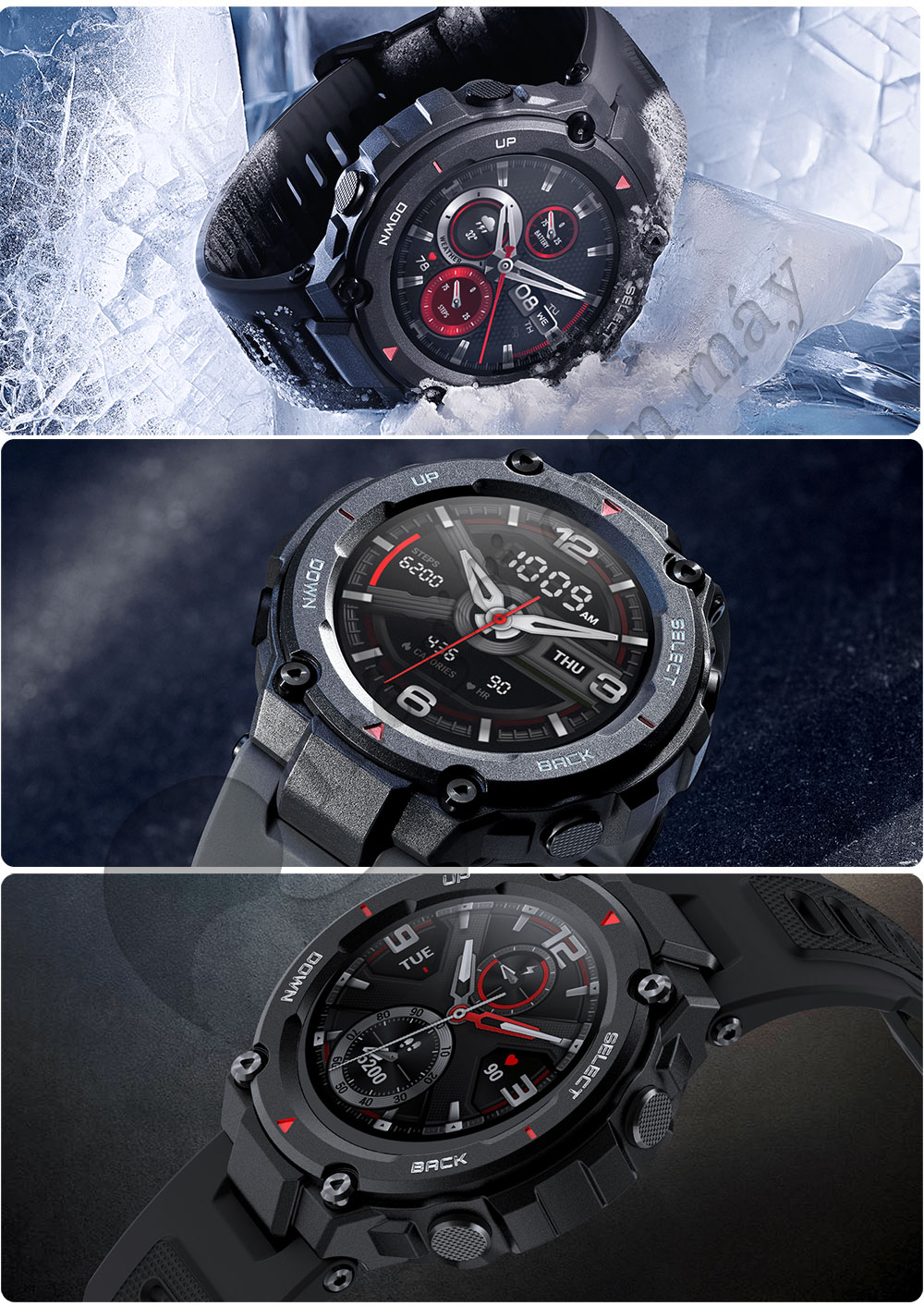 Là một chiếc đồng hồ đạt tiêu chuẩn quân đội, Amazfit T-Rex tất nhiên sẽ có 4 nút bấm cứng ở 2 cạnh bên, bao gồm 2 phím Up/Down ở cạnh trái và 2 phím Select/Back ở cạnh phải. 4 phím này hoàn toàn có thể giúp người dùng điều hướng và thao tác với giao diện máy khi không thể sử dụng cảm ứng ở một số điều kiện môi trường.