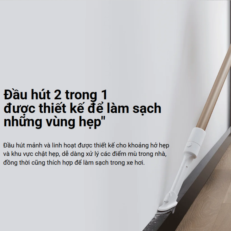 Thiết kế chổi của máy hút bụi cầm tay Xiaomi Mi Vacuum Cleaner G9 Plus được chăm chút đặc biệt để đảm bảo hiệu suất hút tối đa và tiện ích trong quá trình vệ sinh. Theo đó, thiết bị được trang bị một chiếc chổi chuyên nghiệp với bộ đầu chổi chức năng 2 trong 1 mới. Đầu chổi có thể xoay linh hoạt và dễ dàng di chuyển trong mọi góc cạnh, giúp bạn tiếp cận và làm sạch mọi khu vực khó tiếp cận nhất.