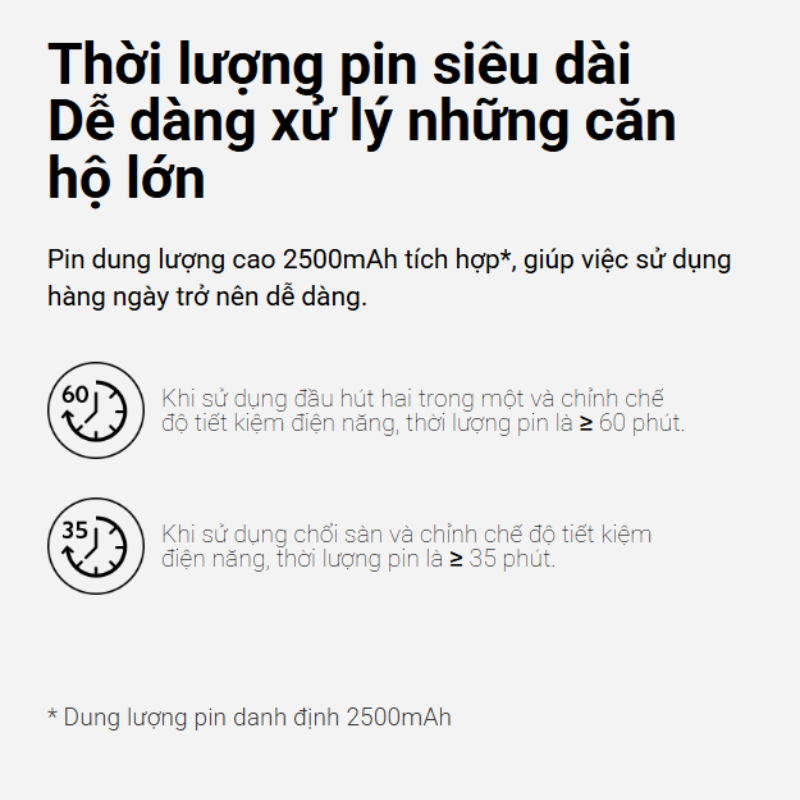 * Thời lượng pin 35 phút: Dữ liệu từ Phòng thí nghiệm Dreame. Khi sử dụng chổi sàn và chỉnh chế độ tiết kiệm điện năng, thời lượng pin là ≥ 35 phút. Báo cáo số: 0457-22A-01.