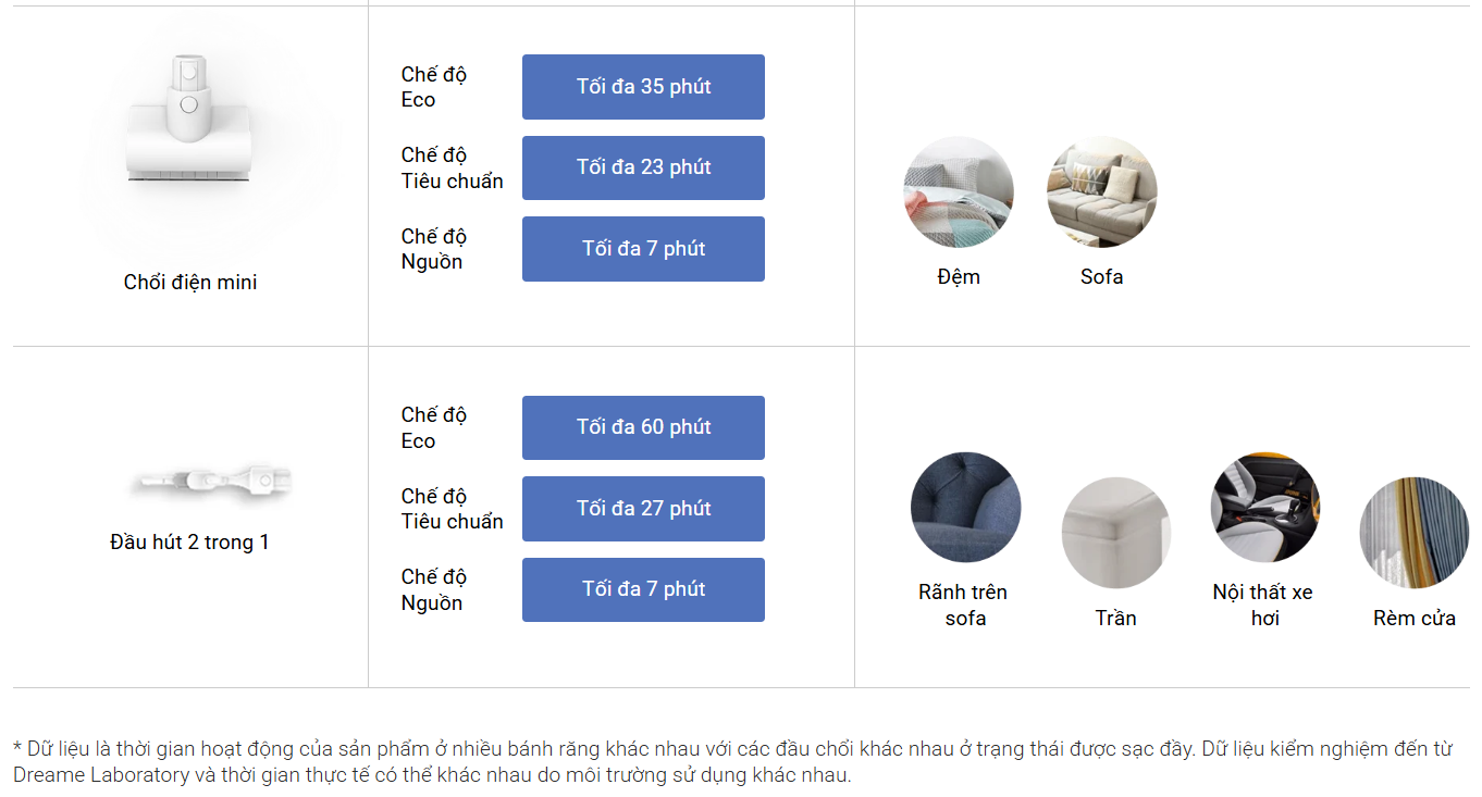 * Thời lượng pin 60 phút: Dữ liệu từ Phòng thí nghiệm Dreame. Khi sử dụng đầu hút hai trong một và chỉnh chế độ tiết kiệm điện năng, thời lượng pin là ≥ 60 phút. Báo cáo số: 0457-22A-01.