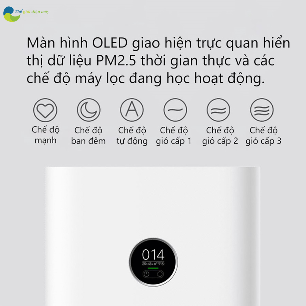 Máy lọc không khí Xiaomi Mi Air Purifier 4 Pro được lắp đặt màn hình hiển thị OLED được nâng cấp đáng kể. Màn hình OLED giúp Mi Air Purifier 4 Pro hiển thị những thông tin cần thiết như giá trị PM2.5, độ ẩm, nhiệt độ, điều khiển các chế độ khác nhau. Với ba mức hiển thị xanh – cam – đỏ, bạn sẽ dễ dàng theo dõi mức độ PM2.5 của không khí xung quanh căn phòng và thực hiện lọc khí khi cần thiết.