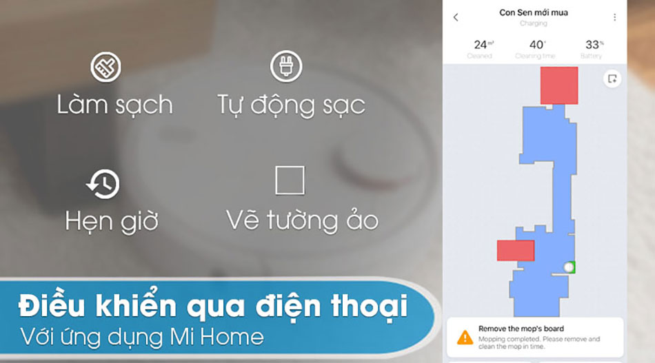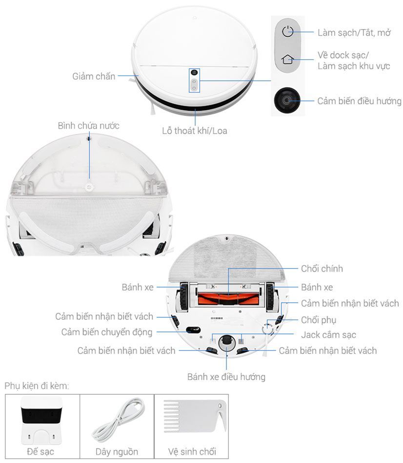 | Tính năng khác | Điều khiển bằng giọng nói Điều khiển bằng điện thoại Tự quay về đế sạc Vừa hút bụi và lau sàn |