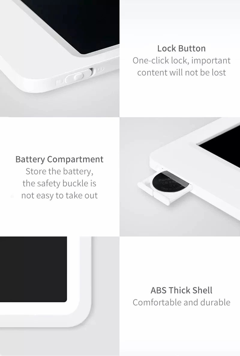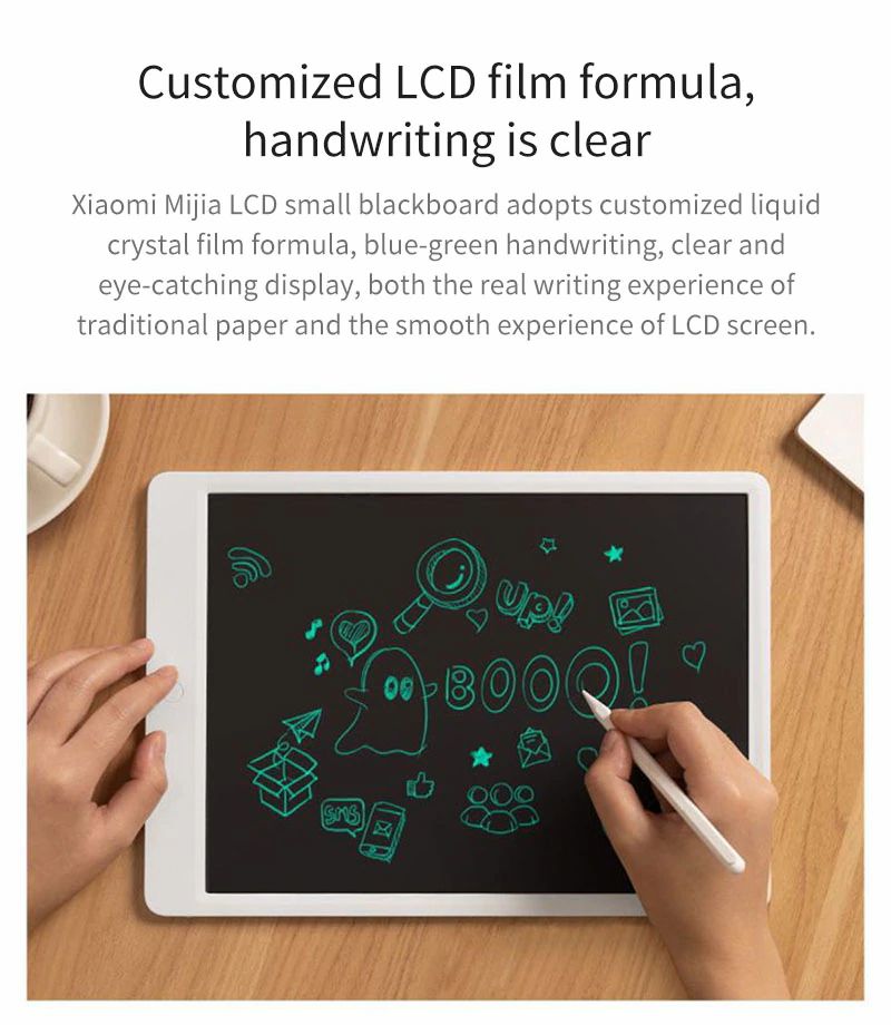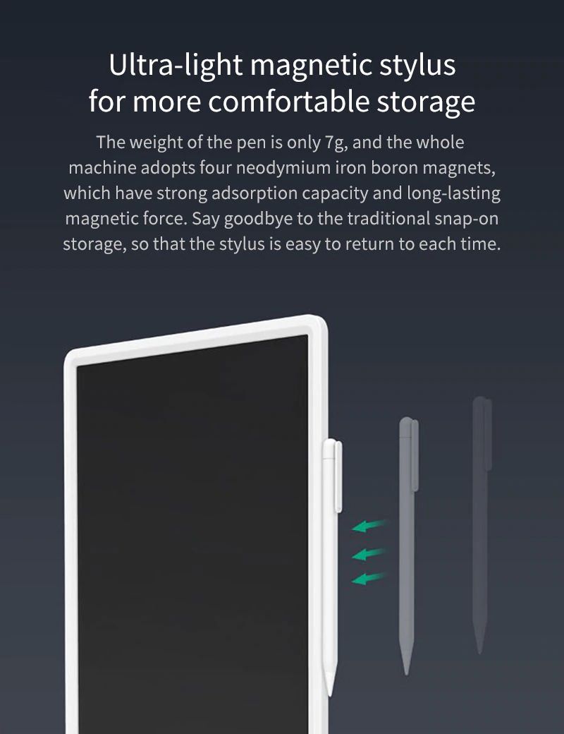 Bảng vẽ điện tử thông minh Xiaomi áp dụng công nghệ cảm biến áp suất rất nhạy và màn hình tinh thể lỏng LCD. Toàn bộ bảng vẽ sử dụng 4 nam châm boron sắt Neodymium, có lực từ mạnh mẽ cho khả năng hấp phụ mạnh giúp cho việc viết vẽ trở nên nhẹ nhàng hơn. Do đó khi viết, độ dày chữ viết sẽ phụ thuộc vào lực tác động lên đầu bút và mặt bảng giống như khi viết trên giấy.