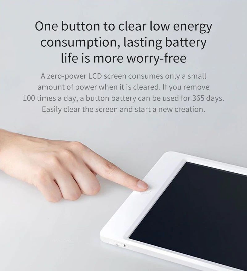 Nhằm đem lại sự thuận tiện, đơn giản, linh hoạt khi sử dụng nhà sản xuất đã trang bị cho bảng vẽ Xiaomi LCD một nút xóa vật lý. Màn hình LCD Zero-Power chỉ tiêu thụ một lượng nhỏ năng lượng khi bạn xóa đi thông tin hay hình ảnh có trên bảng. Nếu bạn xóa 100 lần một ngày thì dung lượng pin có thể sử dụng trong 365 ngày.