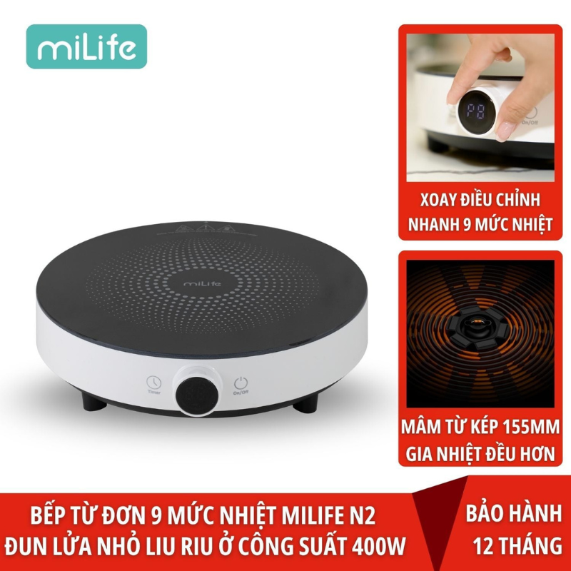 Bếp từ đơn tròn miLife N2 với công suất mạnh mẽ 2100w · 9 mức độ nhiệt khác nhau · hỗ trợ đun liu riu nhiệt độ thấp · hẹn giờ 99 phút · núm xoay dễ điều khiển·cắm điện là chạy·kích thước 250x250x70mm giúp tiết kiệm không gian sử dụng·màu sắc trắng trẻ trung·phù hợp nhiều mục đích sử dụng