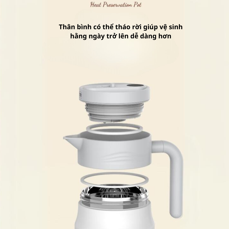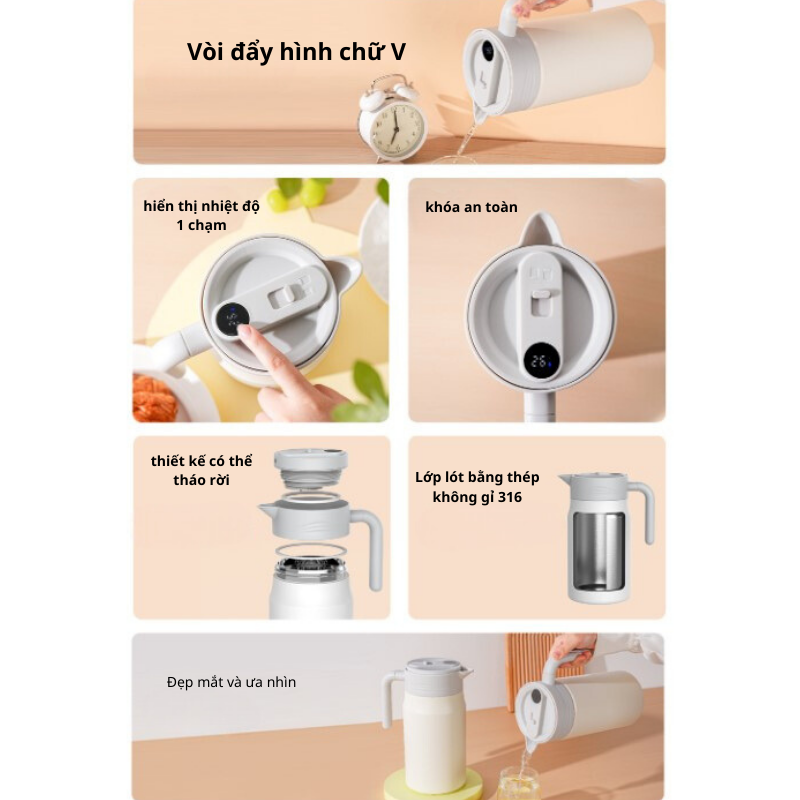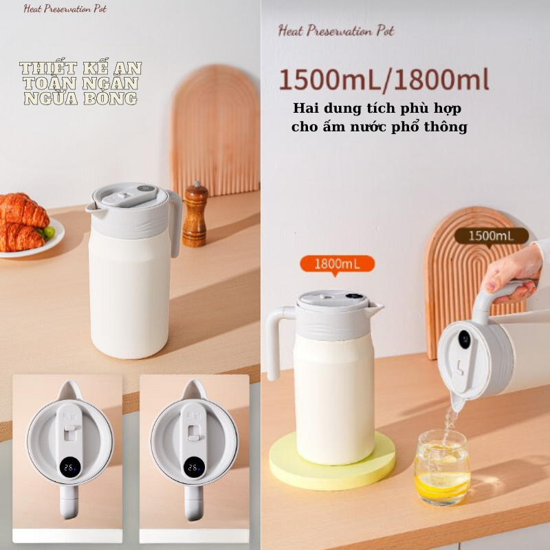 Cấu trúc cách nhiệt năm lớp với vỏ ngoài bằng thép không gỉ và lớp chân không, cung cấp khả năng giữ nhiệt lâu dài và hiệu quả. Nắp bình có khóa an toàn, ngăn chặn việc mở nắp không mong muốn và tránh nguy cơ bị bắn nước nóng ra ngoài, đặc biệt quan trọng khi có trẻ em