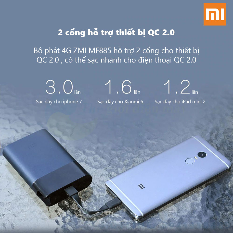 Không dừng lại ở đó bộ phát wifi di động ZMI MF885 cũng được trang bị tính năng sạc nhanh Quick Charge 2.0 trên cả 2 chiều. Không những giúp tăng tốc độ sạc cho thiết bị điện thoại, máy tính bảng mà chúng ta cũng có thể sử dụng những cốc sạc nhanh QC 2.0 để sạc lại cho bộ phát. Tiết kiệm khá nhiều thời gian cho người dùng.
