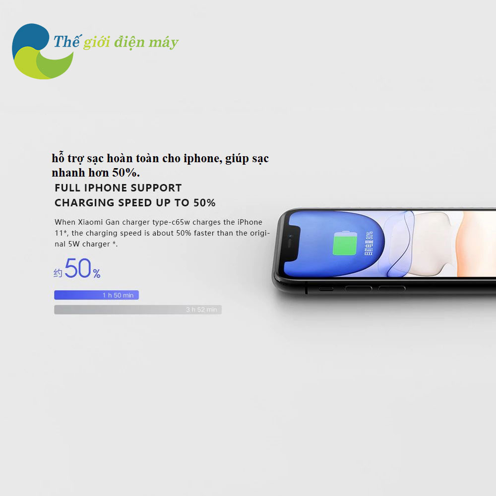 Bộ sạc Xiaomi AD65G GaN là lựa chọn hàng đầu khi cung cấp năng lượng cho các dòng điện thoại Xiaomi. Cụ thể bộ sạc có thể sạc 100% cho Mi 10 Pro trong 45 phút với dòng sạc lên đến 50W Max. Ngoài ra, tốc độ sạc của các dòng điện thoại iPhone cũng có thể tăng lên khoảng 50% khi sử dụng bộ sạc Xiaomi GaN thay bằng các bộ sạc thông thường.