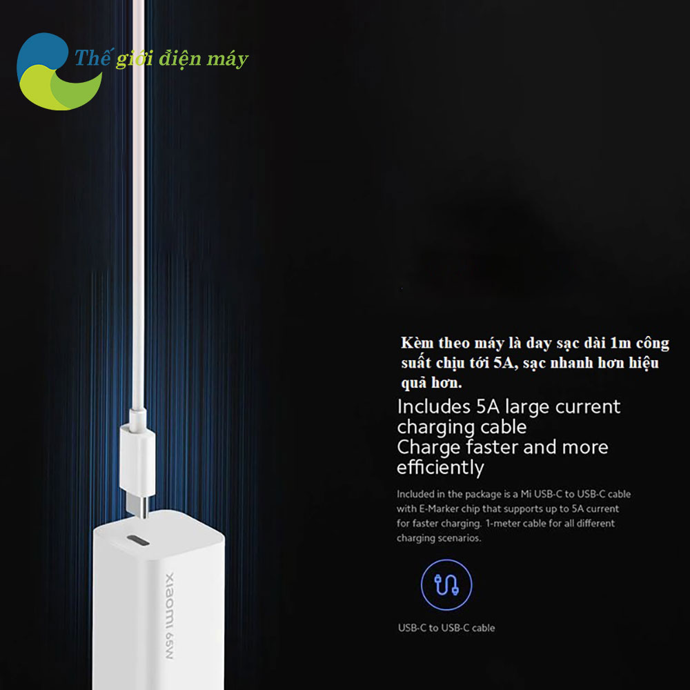Bên cạnh cốc sạc thì Xiaomi còn cung cấp sợi cáp Type-C to Type-C được trang bị chip E-Marker với dòng điện cao 5A cung cấp khả năng sạc nhanh và hiệu quả hơn. Ngoài ra, sợi cáp có chiều dài 1m đủ để đáp ứng nhu cầu sạc trong mọi trường hợp khác nhau.