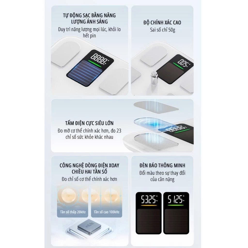miLife S40 là cân đo phân tích 23 chỉ số sức khỏe cơ thể · phân tích tỷ lệ mỡ, béo phì, lượng nước · quản lý qua ứng dụng mihome hỗ trợ tiếng Việt · sử dụng năng nượng mặt trời nên cả đời không cần sạc điện · màn hình hiển thị tinh tế · chịu tải 180Kg