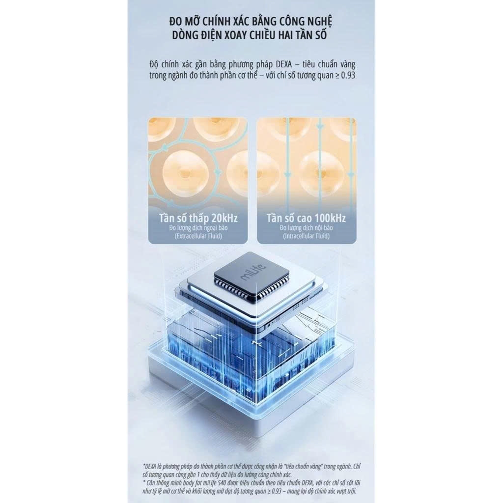 Cân body fat scale miLife S40 sử dụng công nghệ tiên tiến với dòng điện xoay chiều hai tần số, giúp xâm nhập vào tế bào để đo lường trở kháng của dịch lý và ngoại bào, từ đó cung cấp các chỉ số sức khỏe chuẩn xác như lượng mỡ, nước, cơ và nhiều thông số khác. Cụ thể là tần số 50KHz giúp đo lượng dịch ngoại bào, bao gồm nước trong máu và dịch mô; trong khi tần số 250KHz thì đánh giá lượng dịch nội bào, liên quan đến cơ, mỡ, xương và nội tạng.