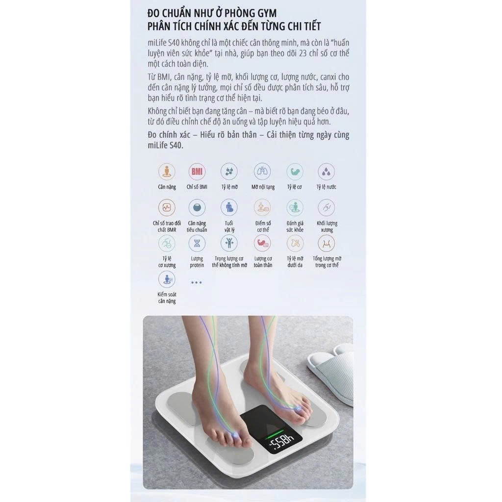 Cân điện tử thông minh miLife S40 hỗ trợ đo đến 23 chỉ số của cơ thể, chỉ bằng một phép đo như cân nặng, BMI, tuổi cơ thể, nước cơ thể, hàm lượng nước trong cơ thể, tỷ lệ % mỡ trong cơ thể, khối lượng chất béo, chất lượng đạm, tỷ lệ chất đạm, khối lượng cơ, tỷ lệ cơ bắp, hàm lượng cơ xương, tỷ lệ cơ xương, mức mỡ nội tạng. Từ đó tiến hành phân tích chuyên sâu về tình trạng sức khỏe, tìm ra nguyên nhân béo phì,...để người dùng có thể dễ dàng thấy được những thay đổi về thể chất và thực hiện lối sống, ăn uống khoa học hơn.