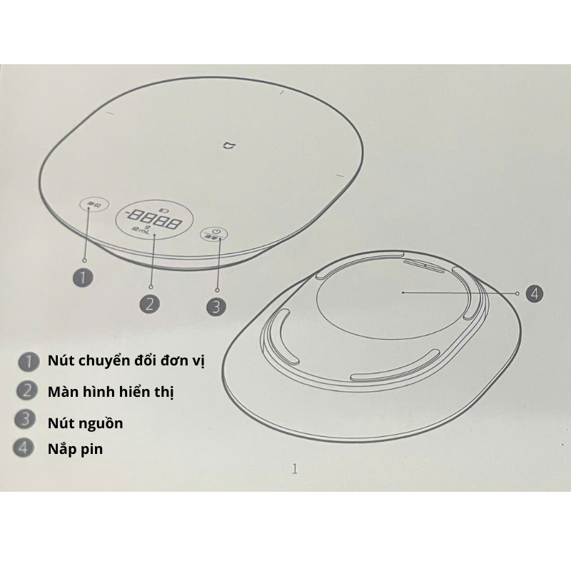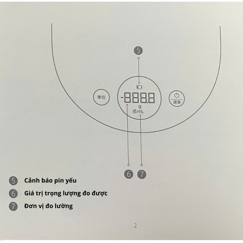 • Khi đặt vật chứa lên cân, nhấn nút nguồn để màn hình trở về 0g.