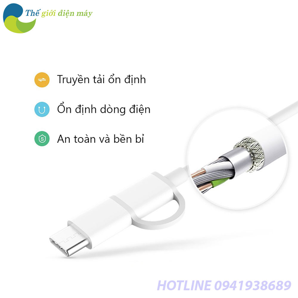 Giữa 2 đầu Type-C VÀ Micro USB, nhà sản xuất sáng tạo thêm một dây nối bằng nhựa dẻo để khi bạn sử dụng đầu Micro USB, thì đầu Type-C sẽ được dây nối giữ lại. Nhờ đó sẽ tránh được việc thất lạc đầu sạc khi tháo rời ra.