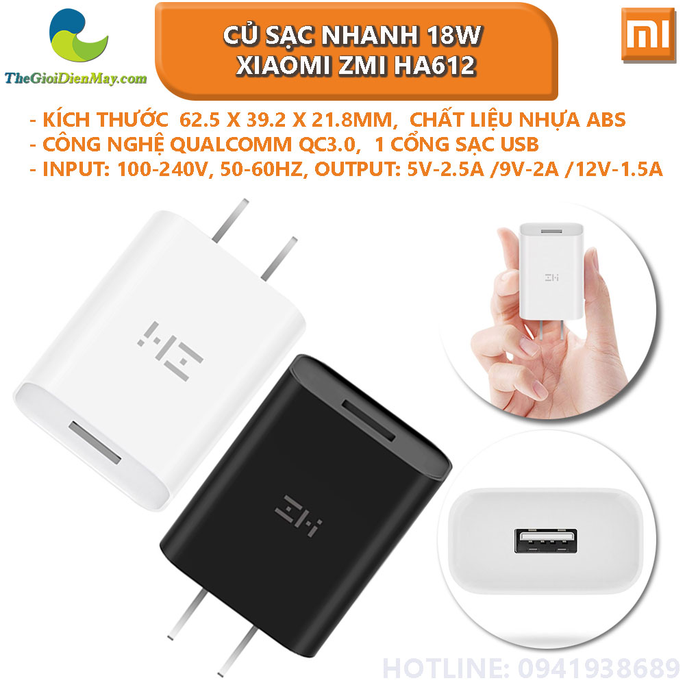 Sạc được trang bị 2 chân lấy điện dạng dẹp, vì thế nó có thể phù hợp với tất cả các ổ điện tại Việt Nam. Với thiết kế nhỏ gọn của mình thì thân sạc chỉ đủ chỗ cho 1 cổng USB duy nhất. Tuy nhiên khác với phần lớn các sản phẩm cốc sạc khác, Củ sạc nhanh 18W Xiaomi Zmi HA612 được trạng công nghệ hỗ trợ sạc nhanh hiện đại nhất hiện nay, Qualcomm QC 3.0 danh tiếng. Hứa hẹn sẽ cho tốc độ sạc nhanh gấp 8 lần so với các cốc sạc thông thường. Khả năng cung cấp nhiều dòng ra khác nhau bao gồm 5V - 2.5A, 9V - 2A và 12V - 1.5A. Khả năng tương thích với hầu hết các thiết bị từ smartphone đến tablet, hỗ trợ cả iOS lẫn Android từ. Mạch sạc thông minh trên Củ sạc nhanh 18W Xiaomi Zmi HA612 có khả năng nhận diện thiết bị và điều chỉnh dòng ra phù hợp, giúp tối ưu hiệu năng sạc để mang lại tốc độ sạc cao nhất.