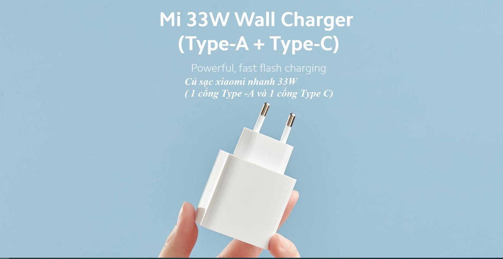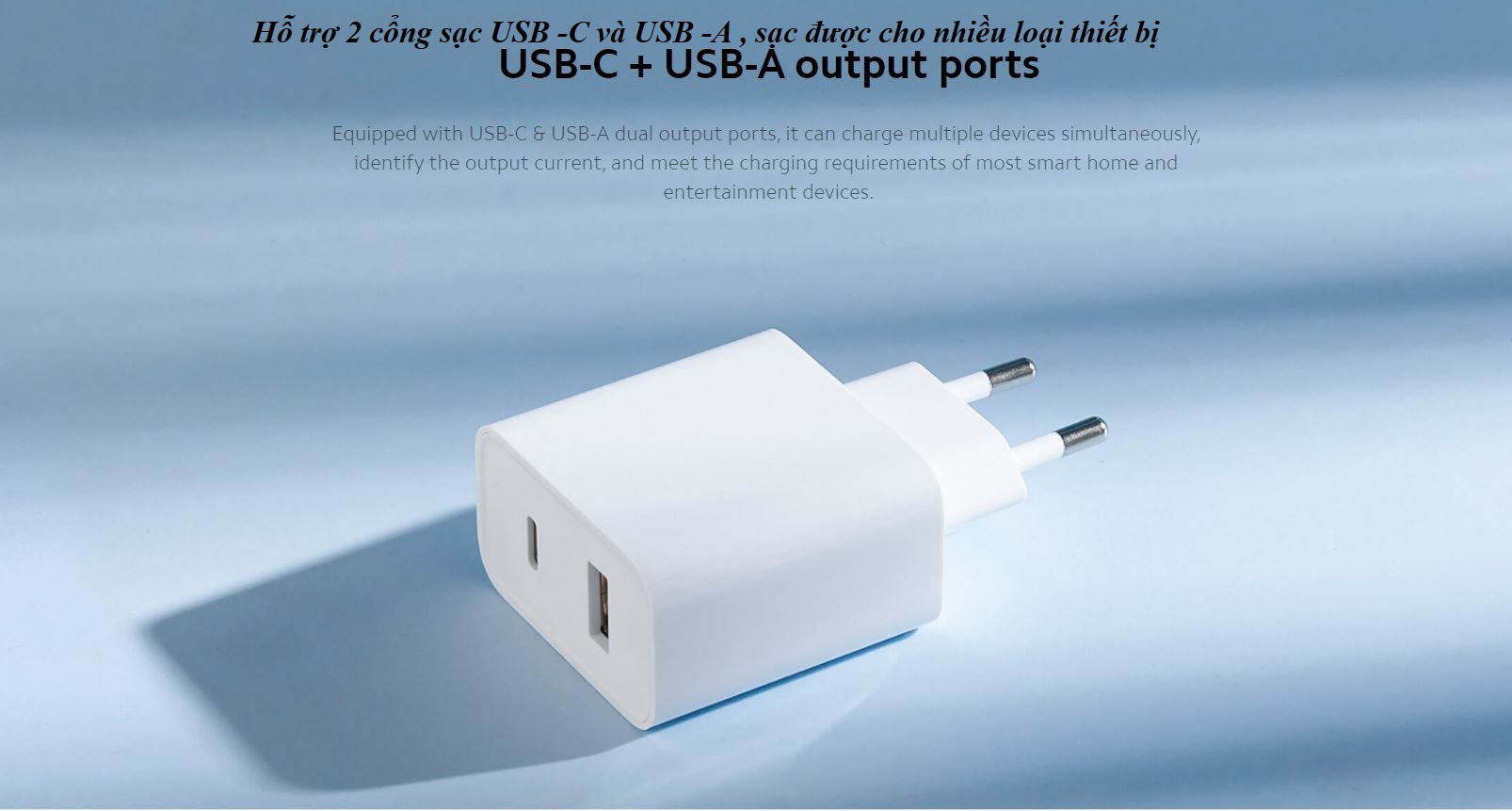 cốc sạc nhanh 33W Xiaomi AD332EU có 2 cổng ra 1 cổng usb A và 1 cổng usb C hỗ trợ sạc được cho nhiều loại thiết bị.