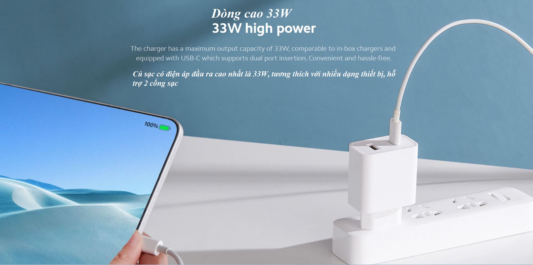 cốc sạc nhanh 33W Xiaomi AD332EU có công suất đầu ra 33W tương thích với nhiều loại thiết bị sạc nhanh như ipad, iphone, các dòng điện thoại.