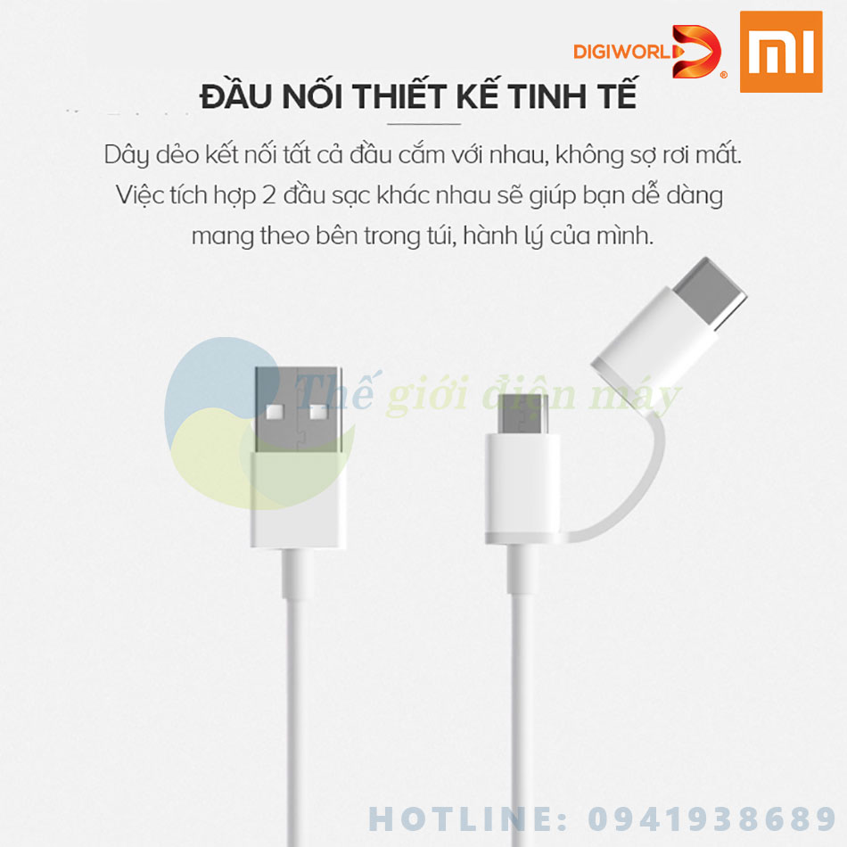 Cáp 2 trong 1 Xiaomi SJX02ZM được thiết kế khá đơn giản kể cả kiểu dáng lẫn màu sắc. Cáp gồm 2 đầu, một đầu USB để bạn cắm vào nguồn sạc, và một đầu Type-C để kết nối với những thiết bị có hỗ trợ cổng này. Tuy nhiên, điểm thú vị của chiếc cáp nằm ở chỗ, ngoài đầu USB Type-C, cáp còn tích hợp thêm một đầu Micro USB. Do đó bạn có thể mở rộng khả năng kết nối của thiết bị cho nhiều loại thiết bị khác nhau.
