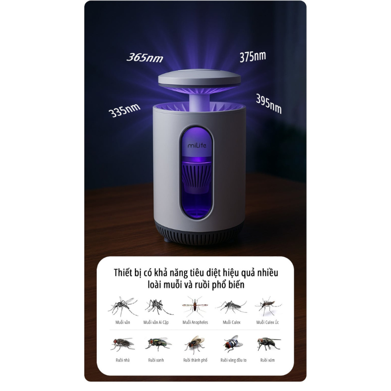 Đèn bắt muỗi miLife K5P trang bị 10 bóng led 360 độ uv thu hút muỗi, côn trùng gây hại từ mọi hướng, sử dụng tia ánh sáng tím để thu hút muỗi, kết hợp với quạt hút mạnh mẽ, tránh muỗi thoát ra được khi đã vào trong, tiêu diệt muỗi hiệu quả.