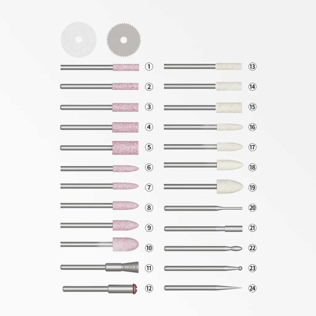 Quy cách đóng gói: 1 thân máy + 1 cáp sạc + 24 đầu mài + Hộp đựng.