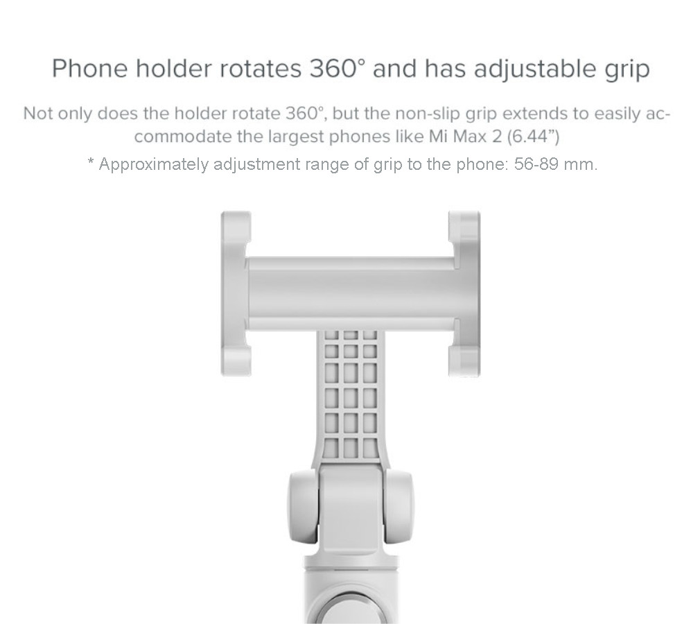 Thành phần không kém phần quan trọng đối với một chiếc gậy tự sướng đó chính là phần giá để cố định điện thoại. Trên selfie stick tripod Xiaomi nhà sản xuất có rất cải tiến thú vị, đầu tiên chúng ta phải kể đến phần giá kẹp có khả năng xoay 360 ̊. Với khả năng này, chúng ta có thể thoải mái lựa chọn tư thế đặt điện thoại theo dạng ngang hay dạng dọc, tùy vào từng nhu cầu và cách sử dụng. Ngoài ra phần giá kẹp vẫn giữ nguyên khả năng gật gù để thay đổi góc độ chụp ảnh, cùng với đó là khả năng mở rộng kích thước giá tùy theo từng loại điện thoại khác nhau.