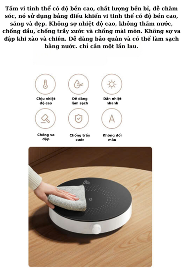 Bề mặt kính của bếp được sử dụng vi tinh thể có độ bền cao, cho khả năng sáng, đẹp cho khả năng chống bám bẩn và chống xước hiệu quả, ngoài ra nó cũng có thể phù hợp với mọi loại nồi và chảo, giúp bạn thoải mái sử dụng các loại nồi khác nhau để chế biến món ăn một cách dễ dàng.