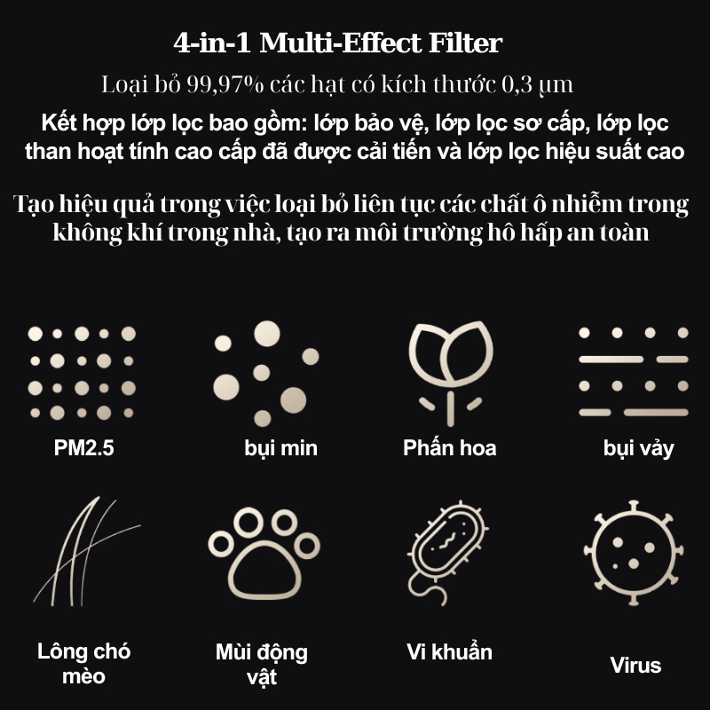 Bộ lọc đa hiệu ứng 4-trong-1 Multi-Effect Filter để tạo ra môi trường thở an toàn, với bề dày lên tới 4cm dày hơn các lõi lọc không khí thông thường trên thị trường.