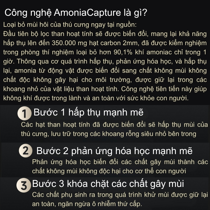 Công nghệ AmmoniaCapture™ là gì? Đây là công nghệ độc quyền đột phá trong việc loại bỏ mùi hôi của vật nuôi trong nhà. Đầu tiên bộ lọc than hoạt tính sẽ được biến đổi, mang lại khả năng hấp thụ lên đến 350.000 mg hạt carbon 2mm, đã được kiểm nghiệm trong phòng thí nghiệm loại bỏ hơn 90,1% khí amoniac chỉ trong 1 giờ. Thông qua cơ quá trình hấp thụ, phản ứng hóa học, và hấp thụ lại, amonia từ động vật được biến đổi sang chất không mùi không chất độc không gây hại cho môi trường, được giữ lại trong các khoang nhỏ của vật liệu than hoạt tính. Công nghệ tiên tiến này giúp không khí được trong lành và an toàn với sức khỏe con người.