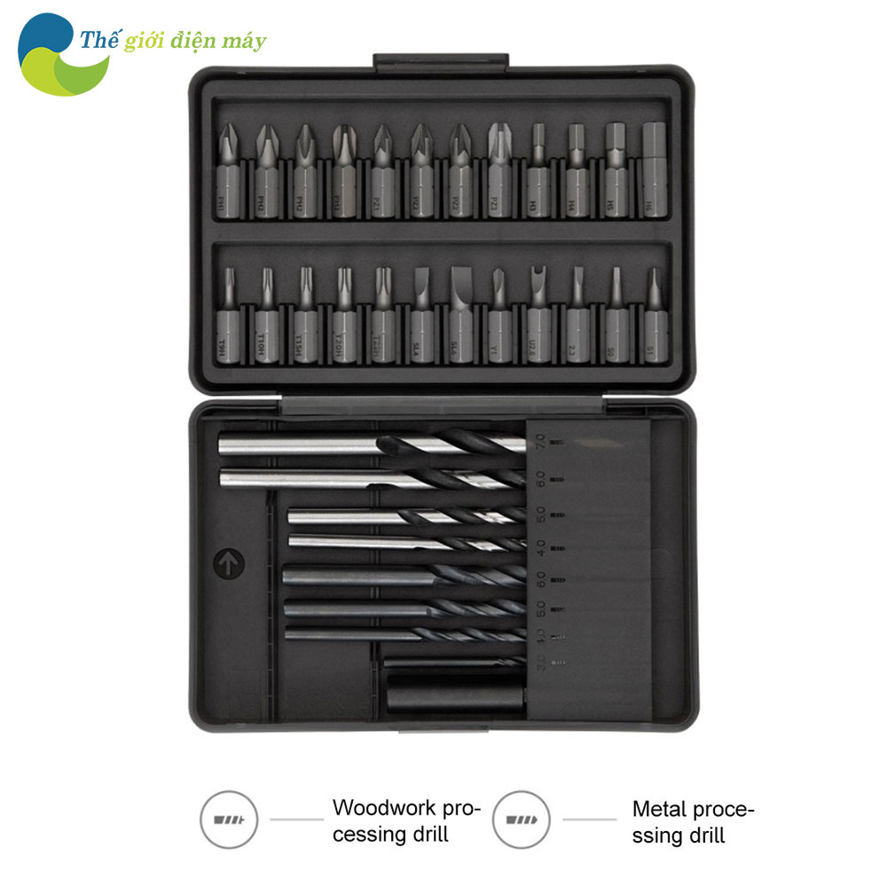 Đi kèm Máy khoan bắn vít điện cầm tay thông minh Xiaomi Mijia Gen 2 chính là bộ phụ kiện 24 loại vit bằng vật liệu thép S2 chất lượng cao với độ cứng lên đến HRC60 cho độ chính xác và độ bền cao hơn, 8 mũi khoan theo máy đáp ứng nhu cầu khoan của các vật liệu khác nhau như khoan gỗ và máy khoan xoắn kim loại, Thanh mở rộng bổ sung 60mm được trang bị trong trường hợp sử dụng ở những không gian hẹp, hạn chế thao tác và tầm nhìn.