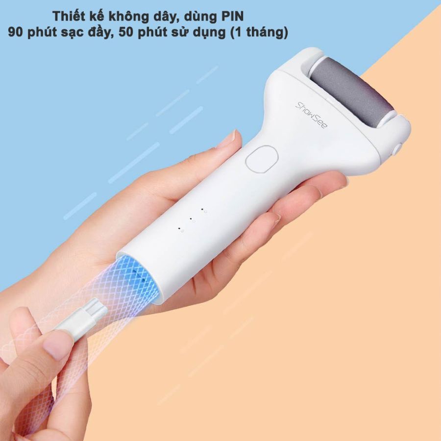 Máy chà gót chân ShowSee B1-W có thiết kế không dây, dùng pin sạc vô cùng tiện dụng. Cụ thể, chỉ mất 90 phút sạc đầy cho 1 lần, thì bạn có đến 50 phút sử dụng liên tục. Như vậy với tần suất sử dụng 1 lần/tuần (10 phút 1 lần) thì chiếc thiết bị có thể được sử dụng đến hơn 1 tháng mới phải sạc lại.