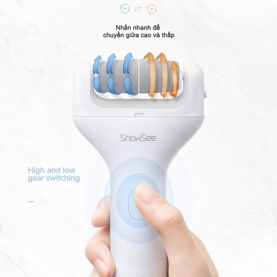 Tùy theo tình trạng da và vùng da dày, mỏng khác nhau mà ShowSee đã trang bị 2 tốc độ với 2 cường độ khác nhau cho người dùng có thể thoải mái tùy chỉnh. Tốc độ thấp 1300RPM xử lý những vùng da chết mỏng, nhẹ. Tốc độ mạnh 1500RPM, giải quyết các vùng da sừng dày.