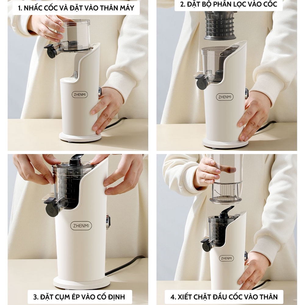 Quy trình 4 bước dễ dàng vệ sinh máy khi sử dụng. Máy ép hoa quả Zhenmi cho khả năng tháo lắp dễ dàng và vệ sinh máy đơn giản chỉ mất 5 giây để làm sạch toàn bộ máy khi sử dụng xong.