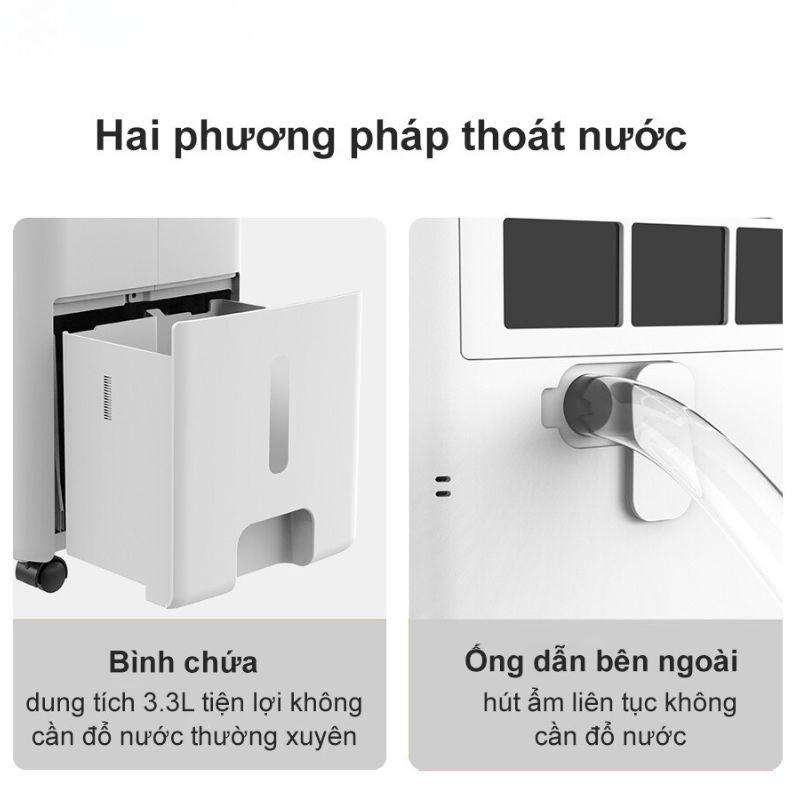 Có thể chọn một trong hai phương pháp thoát nước tùy theo nhu cầu đáp ứng nhu cầu của gia đình bạn. Phương pháp 1: dùng bình chứa với dung tích 3.3L khi đầy máy sẽ tự động dừng hút ẩm, bạn chỉ cần xách đổ nước có thể tận dụng tưới cây trong nhà. Phương pháp 2: dùng ống dẫn thoát nước trực tiếp ra bên ngoài mà không lo quên đổ bỏ nước, hút ẩm liên tục cho cả ngày đêm.