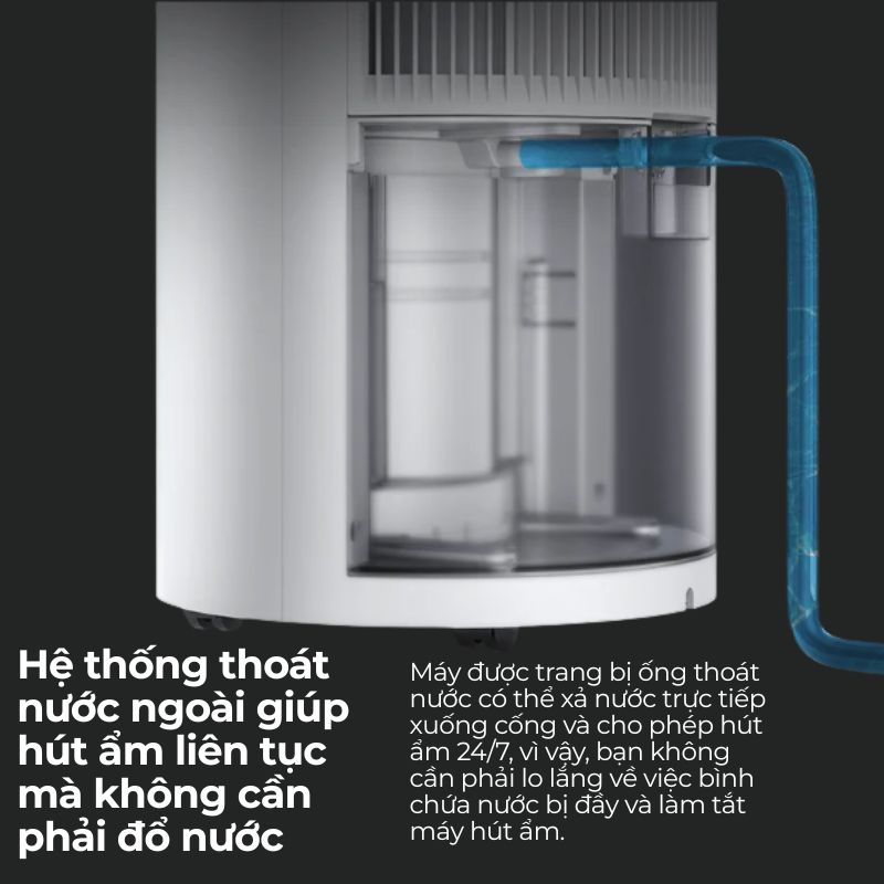 Máy hút ẩm 4.5L cho phép hoạt động nhiều giờ mà không cần đổ nước thường xuyên. Khi bình đầy, máy tự động ngắt đảm bảo an toàn. Ngoài ra, máy hỗ trợ thoát nước liên tục qua ống xả, phù hợp sử dụng 24/7.