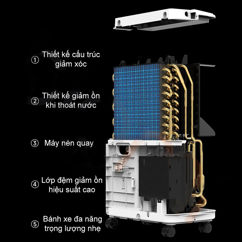 Điểm nổi bật của máy hút ẩm New Widetech 16L là công nghệ giảm tiếng ồn năm lớp cải tiến, tối ưu hóa tiếng ồn của gió nhờ thiết kế cấu trúc giảm xóc và lớp đệm giảm xóc hiệu suất cao. Kết hợp với thiết kế giảm ồn đường thoát nước và bánh xe đa năng trọng lượng nhẹ giúp máy có thể vận hành êm ái với độ ồn tối đa chỉ 34.5 dB(A), lý tưởng để sử dụng suốt đêm mà không gây khó chịu cho người dùng. Ngoài ra, bánh xe còn giúp di chuyển máy dễ dàng giữa các phòng mà không tạo tiếng ồn, mang lại sự tiện lợi tối đa cho quá trình sử dụng trong gia đình bạn.
