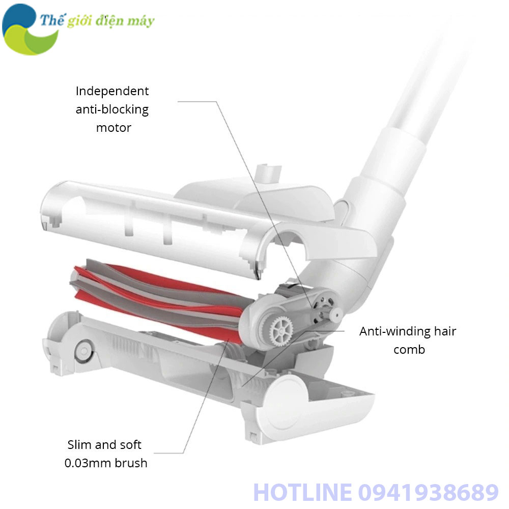 Bên cạnh đó, máy hút bụi có thể chuyển đổi sang chế độ cầm tay, thích hợp làm sạch bụi, vụn bánh trên ghế ô tô, sofa.. Với cấu tạo con lăn chống quấn, giúp tóc và lông thú cưng không bị vướng vào con lăn, không phải vệ sinh lại con lăn sau khi hút bụi, tiện lợi hơn.
