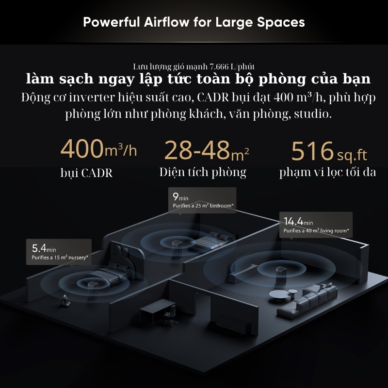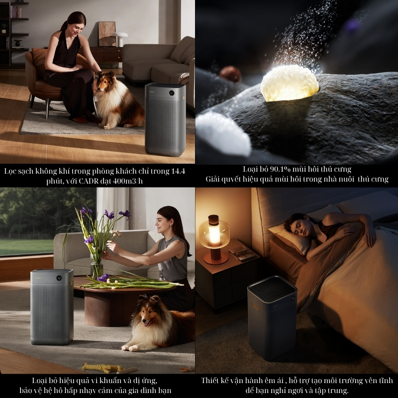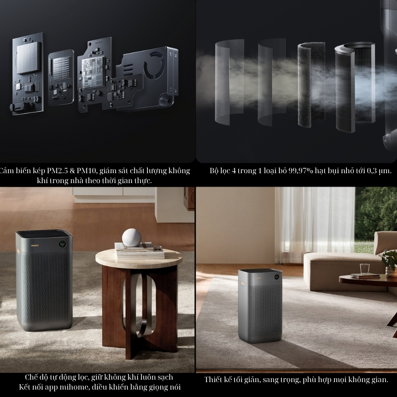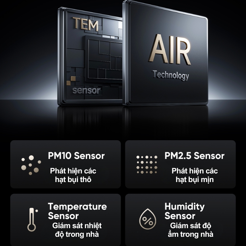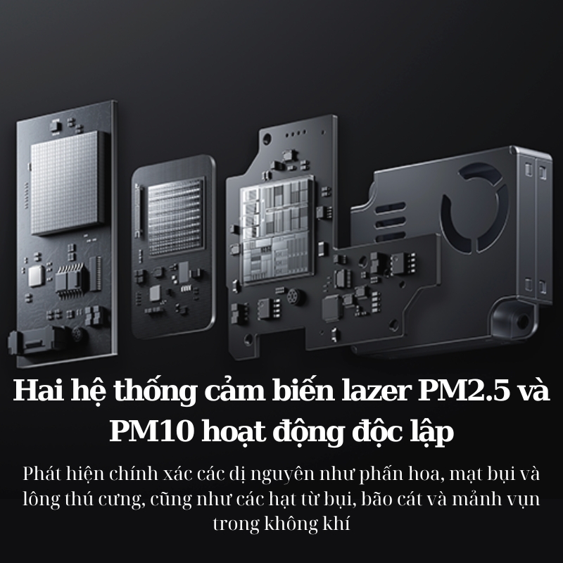 • Cảm biến kép PM2.5 & PM10: Các cảm biến này theo dõi chất lượng không khí trong nhà theo thời gian thực. Chúng phát hiện chính xác các chất gây dị ứng như phấn hoa, mạt bụi, lông vật nuôi, cũng như các hạt bụi và mảnh vụn trong không khí.
