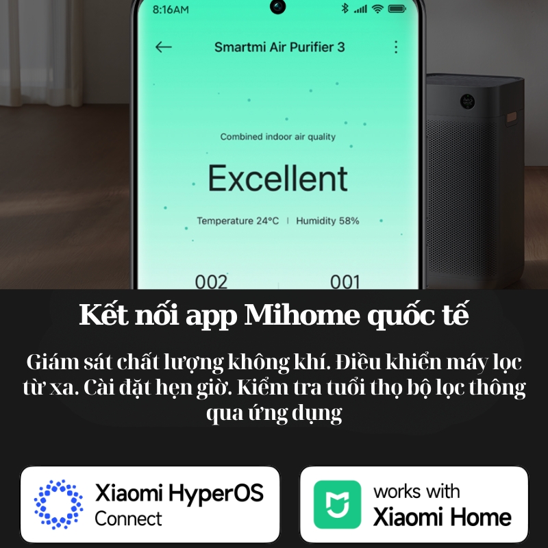 • Điều khiển thông minh (Smart Control): Cho phép bạn kiểm soát máy lọc bất cứ lúc nào. Hỗ trợ điều khiển qua Mi Home App và Điều khiển bằng giọng nói (Voice Control). Smartmi Air Purifier 3 tương thích với Alexa và Google Assistant.