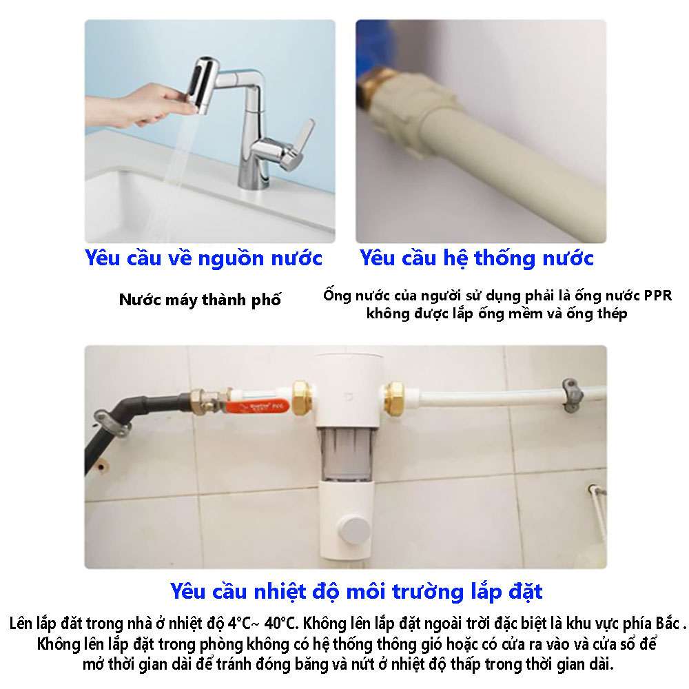 Phạm vi nhiệt độ nước áp dụng : 5°C~38° Kích thước đầu nối DN20 và DN25 PPR áp suất làm việc : 0,1MPa ~ 0.7MPa
