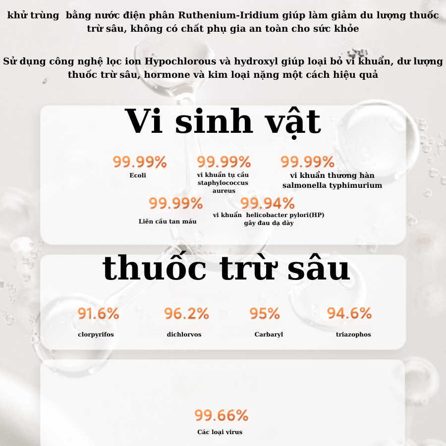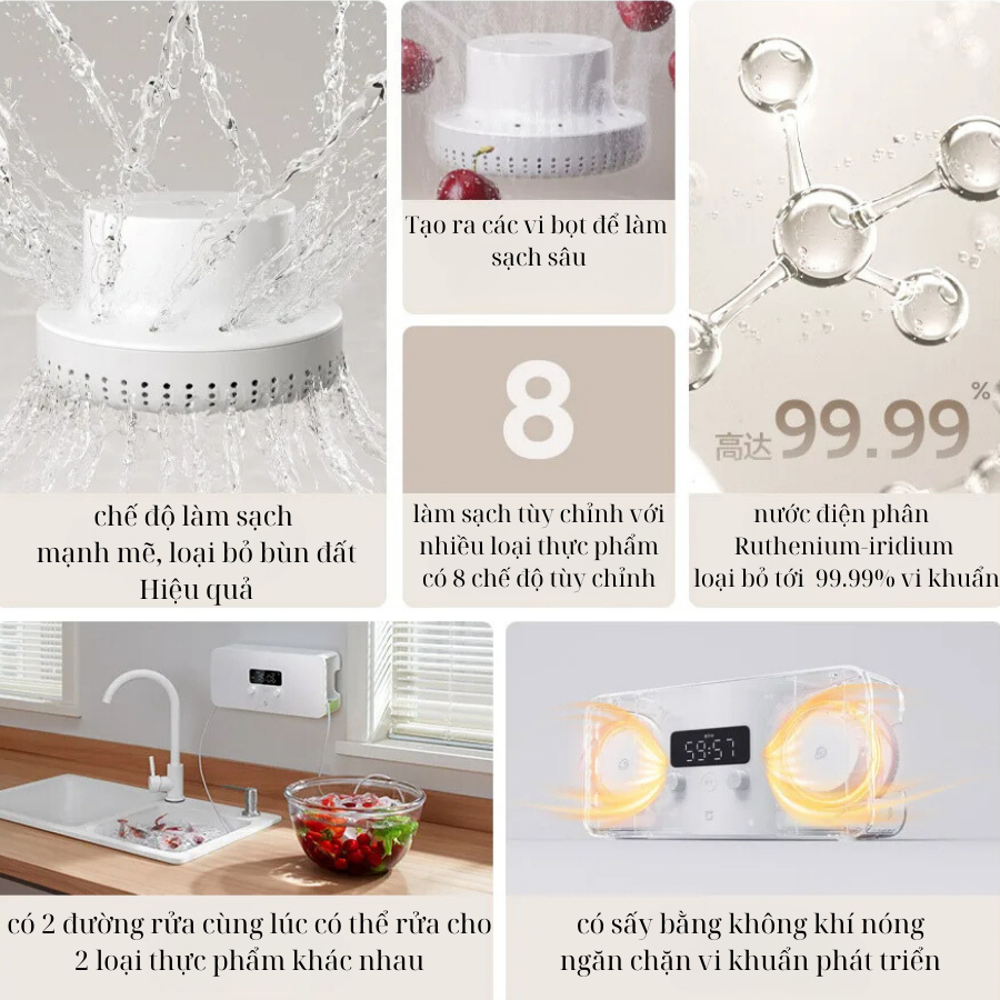 Đầu phun của máy có các lỗ nhỏ giúp phun các tia nước mạnh mẽ để loại bỏ bùn đất. Máy có 8 chế độ làm sạch có thể tùy chỉnh phù hợp với từng loại thực phẩm. Hơn nữa, máy có khả năng loại bỏ 99.99% vi khuẩn, làm cho thực phẩm của bạn sạch sẽ và an toàn hơn. Với công suất 80W mạnh mẽ, máy có thể làm sạch tới 2kg thực phẩm cùng một lúc. Tấm điện phân diện tích lớn tăng cường khả năng lọc sạch của máy. Máy cũng có hai đầu làm sạch độc lập, tăng khả năng làm sạch và cho phép làm sạch đồng thời thịt và rau, tiết kiệm thời gian và giữ cho nguyên liệu của bạn tươi ngon và không bị nhiễm chéo.
