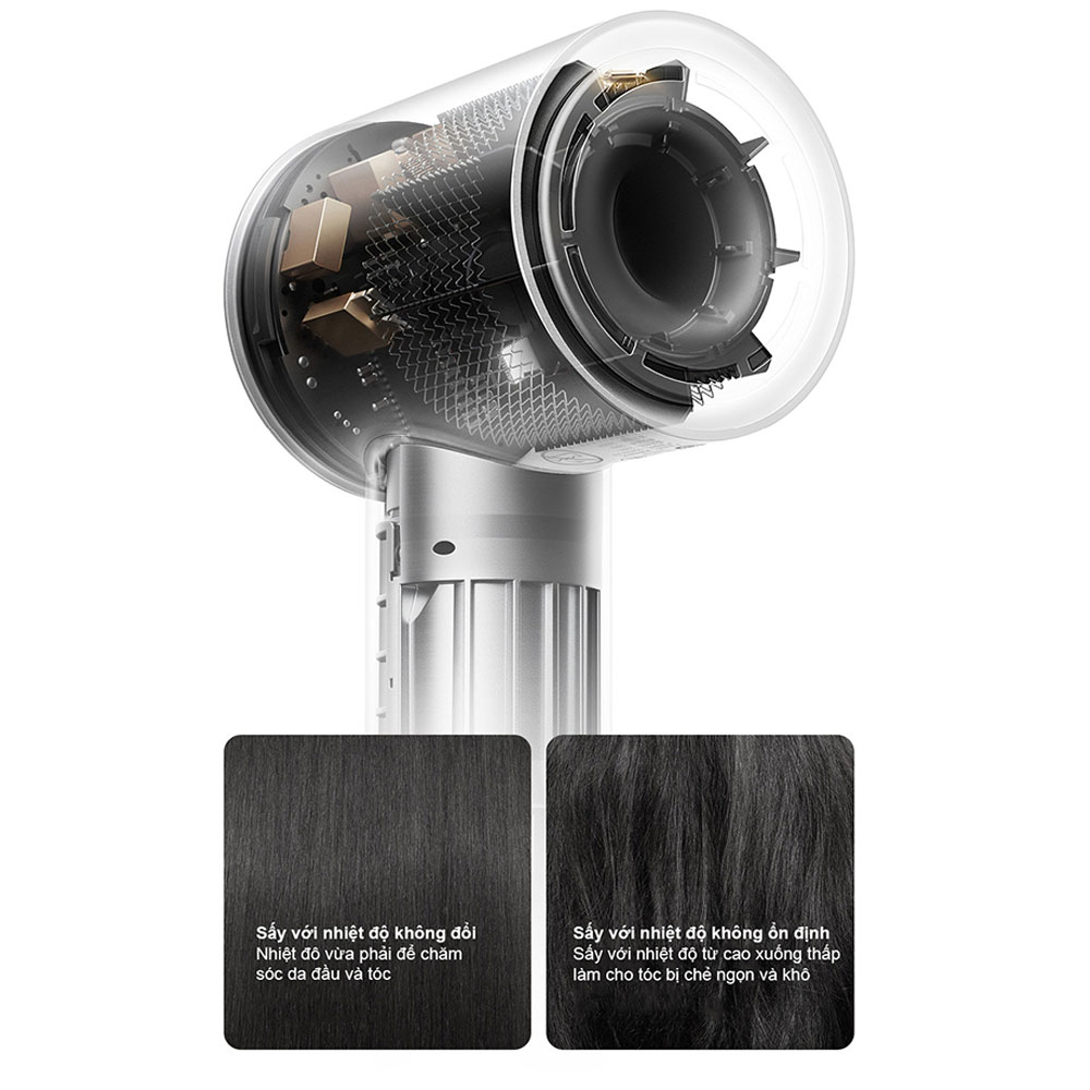 Máy sấy tóc tạo kiểu Xiaomi H501 SE cũng được tích hợp cảm biến nhiệt NTC và bộ xử lý MCU giúp. Từ đó, kiểm soát nhiệt độ thông minh 100 lần/giây giúp theo dõi và điều chỉnh nhiệt độ gió theo thời gian thực để tránh quá nóng và bảo vệ da đầu và tóc từ gốc. Công nghệ sấy tóc ở nhiệt độ không đổi và tốc độ gió cao giúp tóc trở nên mạnh khỏe và óng mượt. Ngược lại việc sấy tóc ở nhiệt độ không ổn định từ cao xuống thấp làm cho tóc dễ bị chẻ ngọn và khô xơ.