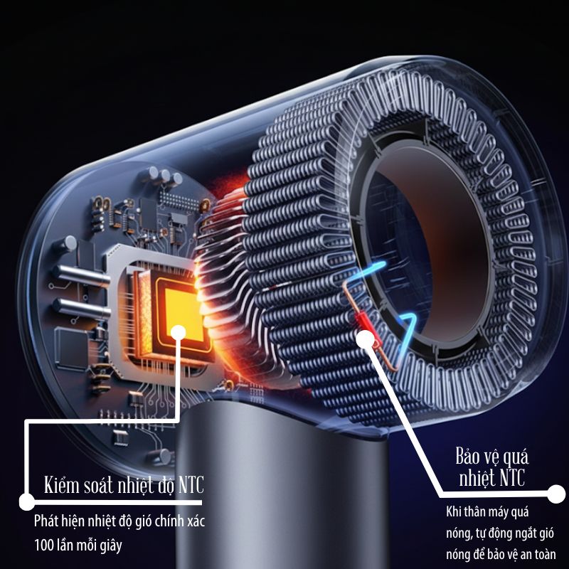 Kiểm soát nhiệt NTC thông minh: Hệ thống cảm biến liên tục kiểm tra nhiệt độ 100 lần mỗi giây. Điều này giúp duy trì mức nhiệt ổn định, ngăn chặn hoàn toàn tình trạng hư tổn do nhiệt độ vượt mức.