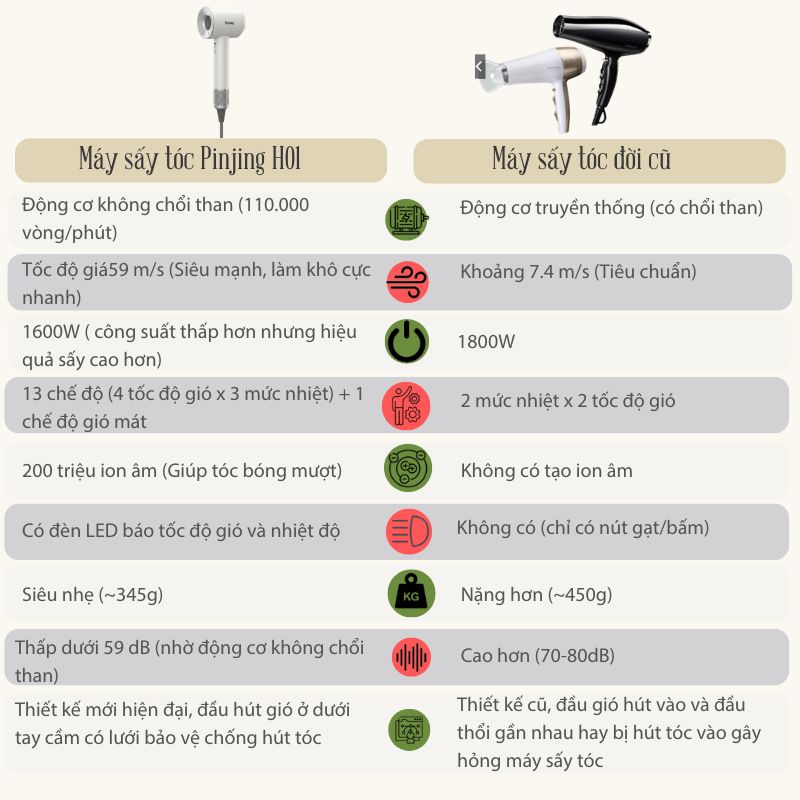 So với các dòng máy sấy cao cấp trên thị trường, Pinjing H01 nổi bật nhờ sự cân bằng giữa hiệu năng mạnh mẽ và khả năng bảo vệ tóc chuyên sâu. Đây không chỉ là một thiết bị gia dụng, mà là một phần trong quy trình chăm sóc sức khỏe và sắc đẹp mỗi ngày.